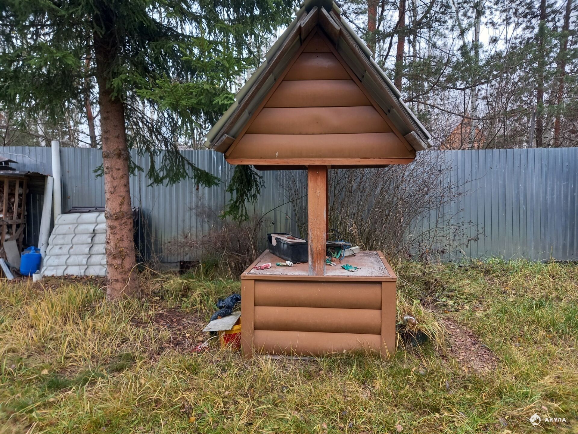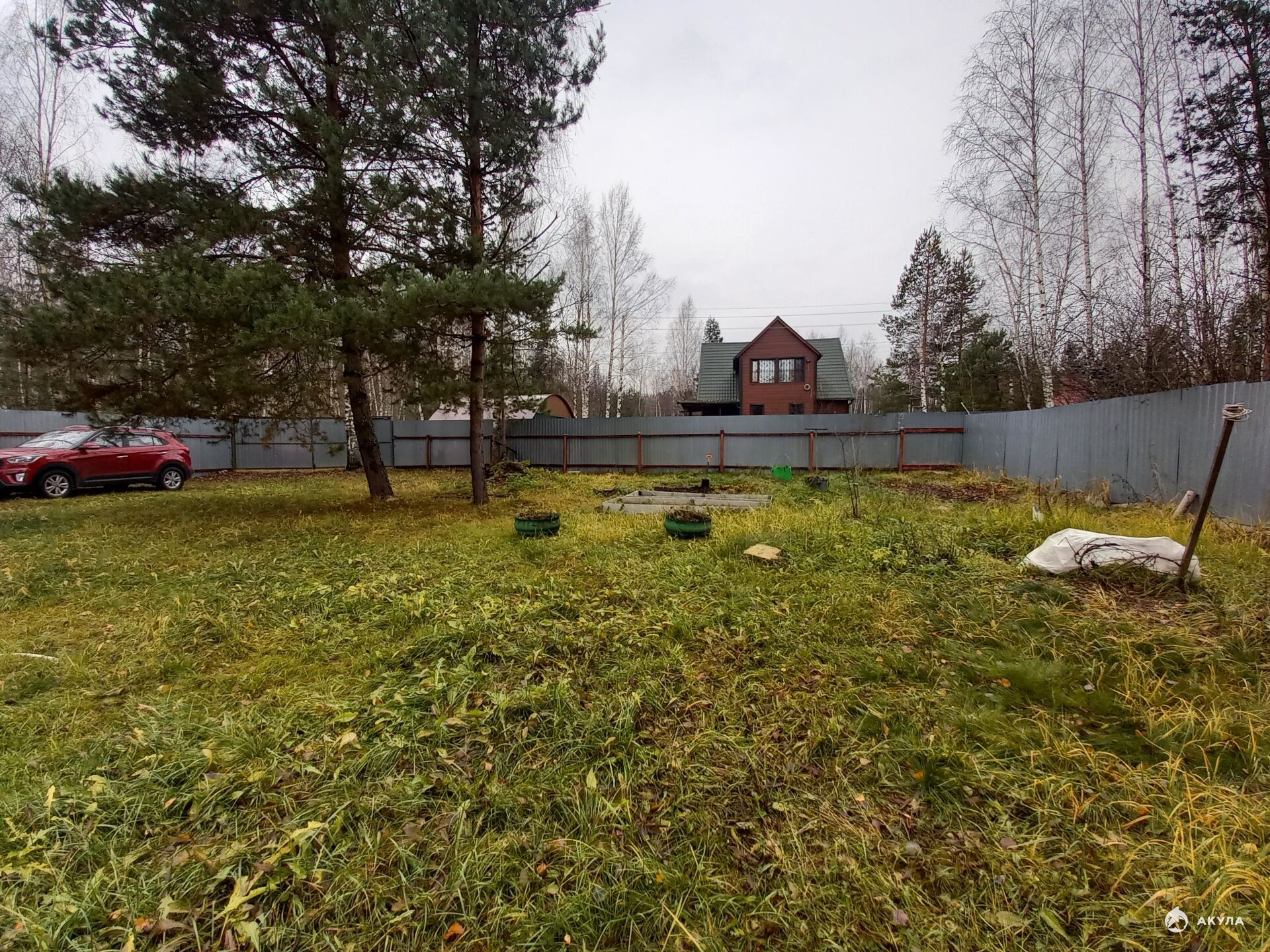 Участок со всех сторон огорожен профлистом, широкие ворота,