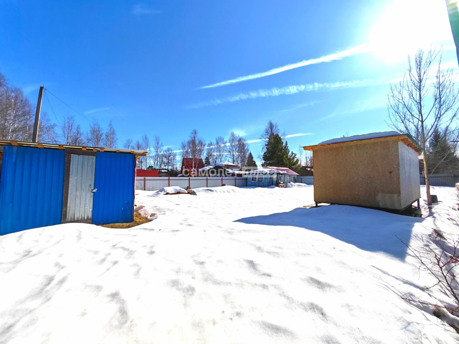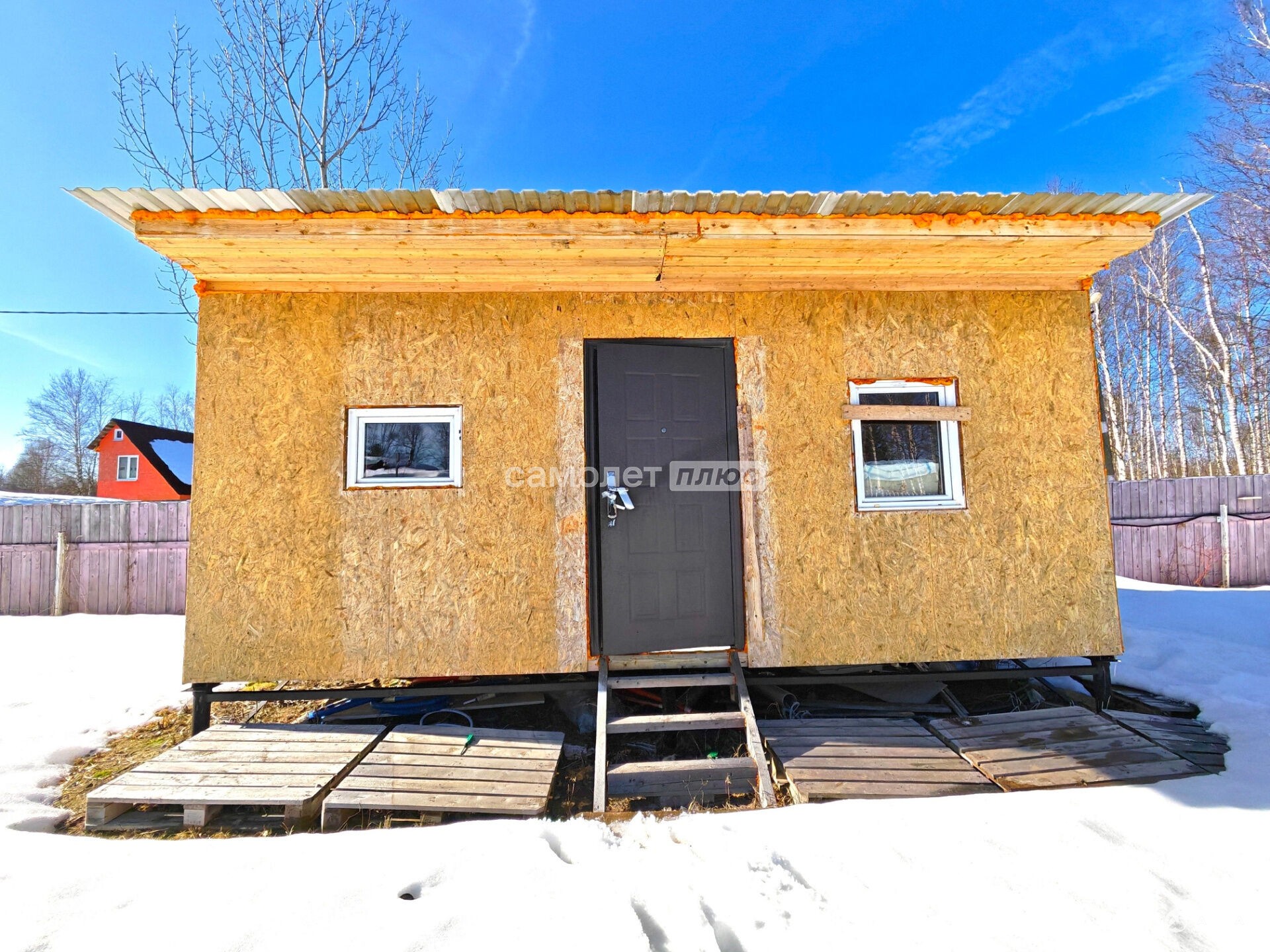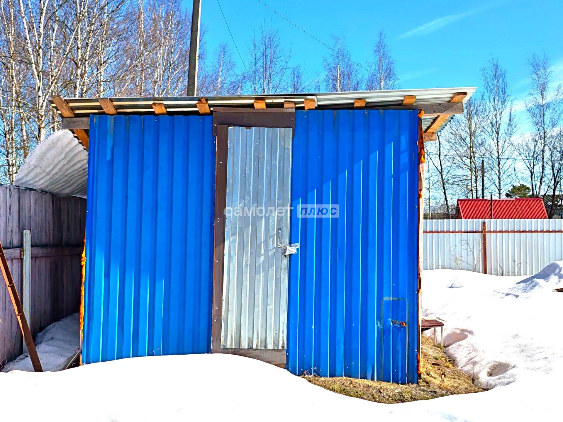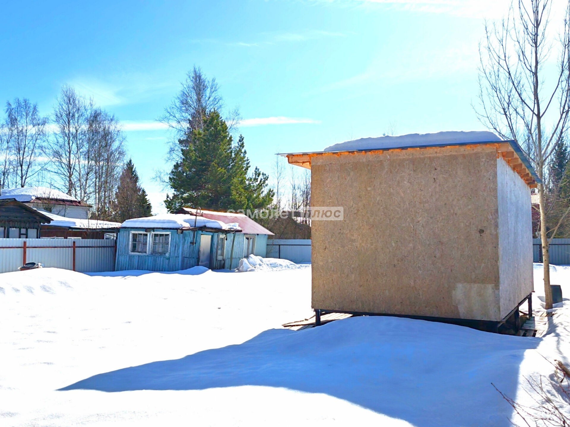 На участке три строения: металлический сарай (гараж), домик старой постройки и новый каркасно-щитовой.