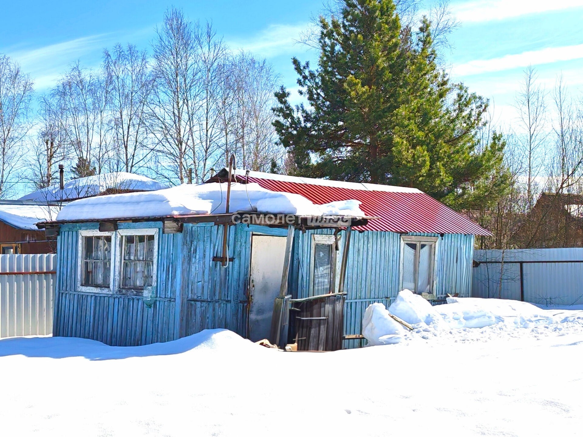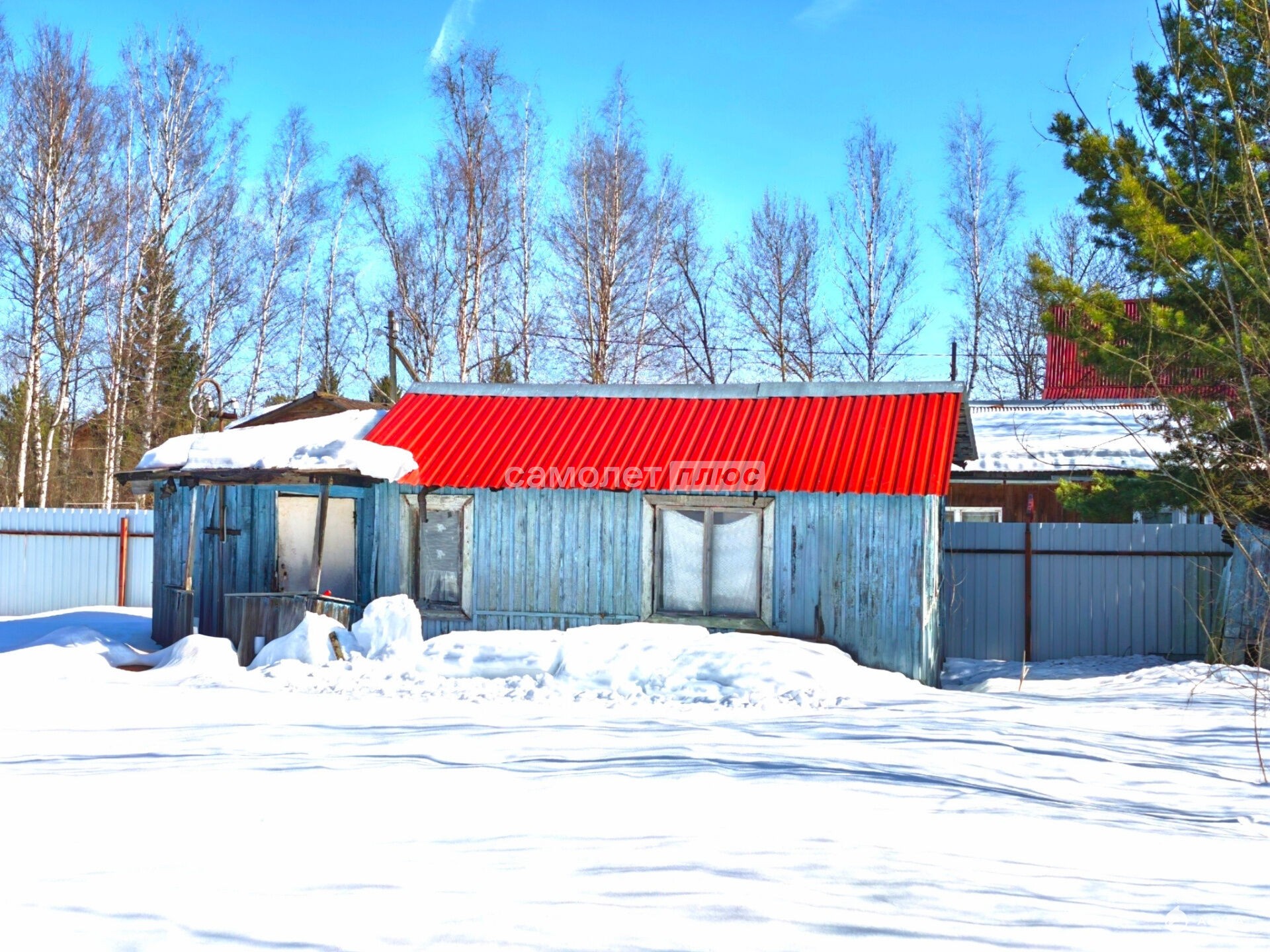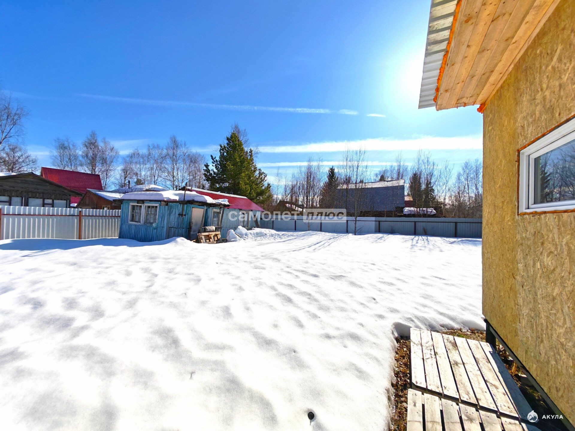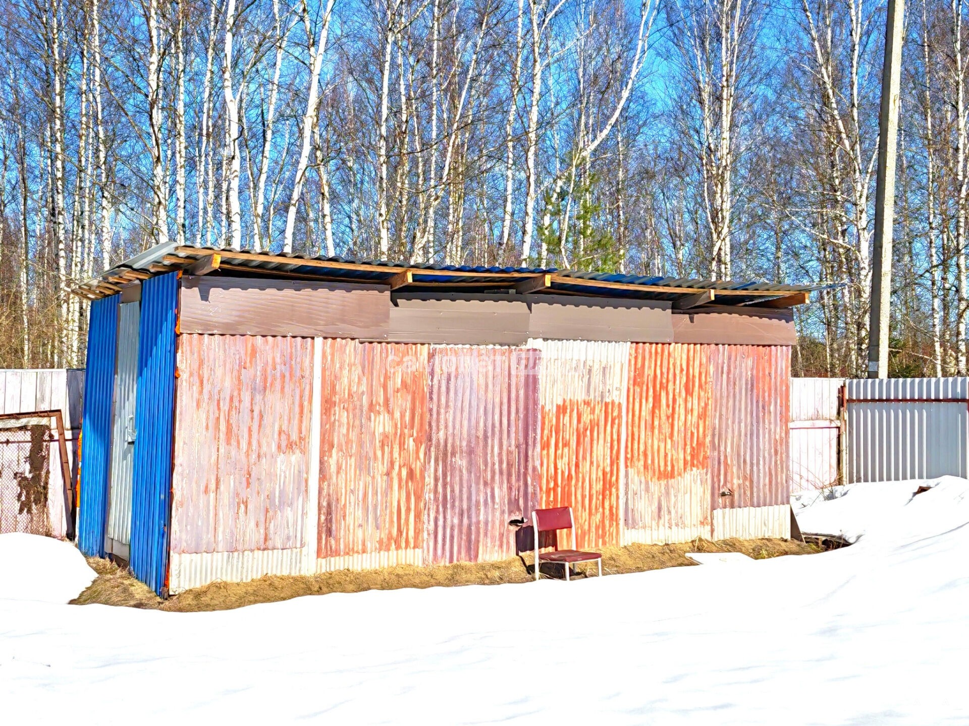 На участке три строения: металлический сарай (гараж), домик старой постройки и новый каркасно-щитовой.