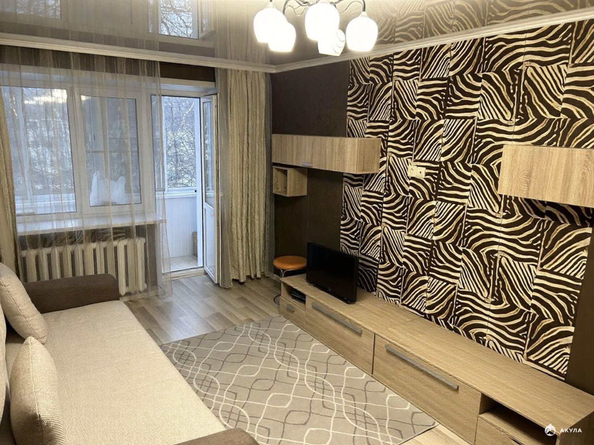 Планировка: Просторная комната с двуспальным диваном, отдельная кухня, совмещенный санузел и застекленный балкон.